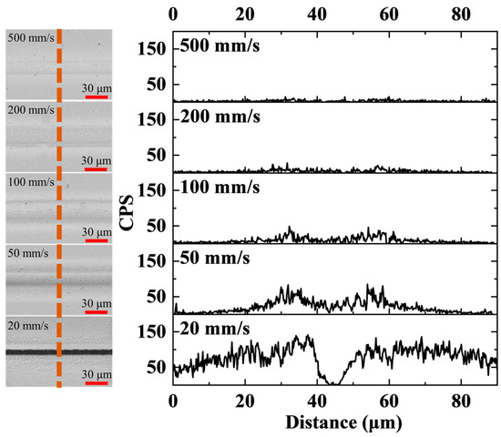 To further investigate the relationship between the scanning speed and oxidation products, we employed energy-dispersive spectroscopy (EDS, ZEISS SmartEDX, Oberkochen, Germany) to analyze the elemental composition of the processing area. The oxygen counts per second (CPS) are shown in Figure 4. These results are consistent with those presented in Figure 2 and Figure 3. In fact, oxygen was most abundant at the edges of the processing grooves and decreased gradually with distance. Notably, when the laser scanning speed exceeded 500 mm/s, the CPS of oxygen were approximately zero, thus indicating that the temperature of the processing area was lower than the oxidation temperature. Our results show that the scanning speed is an important parameter for determining the heat accumulation in the processing area under fixed laser power.