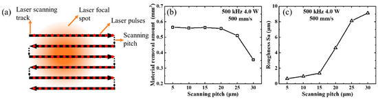 (a) Schematic of the laser scanning method. (b) Material removal amount and (c) roughness of the bottom surface at different laser scanning pitches.