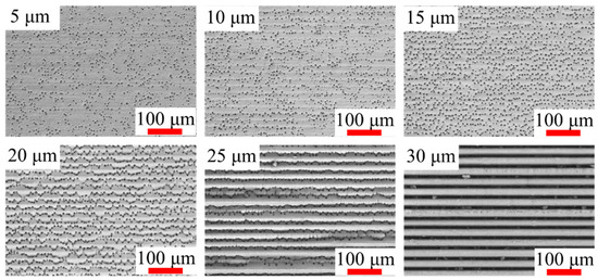 Morphology of the area processed by femtosecond laser at different scanning pitches in the range 5–30 μm under a laser power of 4 W (500 kHz).