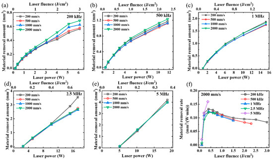 Material removal amount at different laser scanning speeds and powers. Laser repetition frequencies: (a) 200 kHz, (b) 500 kHz, (c) 1 MHz, (d) 2.5 MHz, and (e) 5 MHz. (f) Material removal rate at different laser fluences and repetition frequencies.