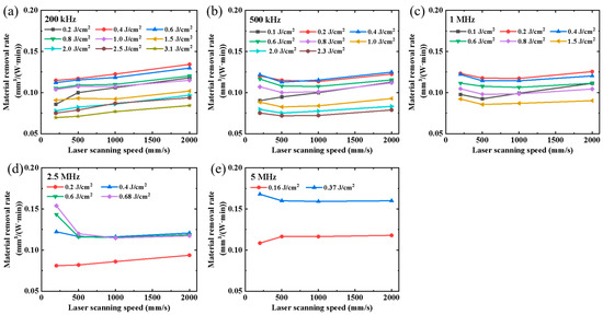 Material removal rate at different laser scanning speeds. Laser repetition frequencies: (a) 200 kHz, (b) 500 kHz, (c) 1 MHz, (d) 2.5 MHz, and (e) 5 MHz.