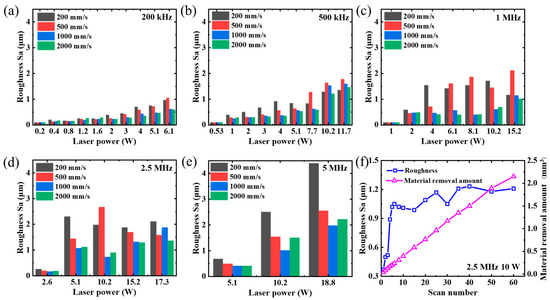 Roughness values of SiC ceramic samples at different laser powers and the following repetition frequencies: (a) 100 kHz, (b) 500 kHz, (c) 1 MHz, (d) 2.5 MHz, and (e) 5 MHz. (f) Roughness values at different scanning numbers, a laser repetition frequency of 2.5 MHz, a laser power of 10.2 W, a laser fluence of 0.4 J/cm2, and a scanning speed of 2000 mm/s.