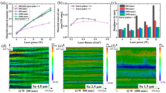 (a) Material removal amount, (b) material removal rate, and (c) roughness at different values of laser power and scanning speed. Surface roughness micrographs at scanning speed of (d) 200 mm/s, (e) 500 mm/s, and (f) 1000 mm/s under laser power of 12 W.