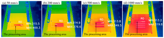 Thermal infrared images of processing areas at different scanning speeds: (a) 50 mm/s, (b) 200 mm/s, (c) 500 mm/s and (d) 1000 mm/s (temperature is indicated by Kelvin (k)).