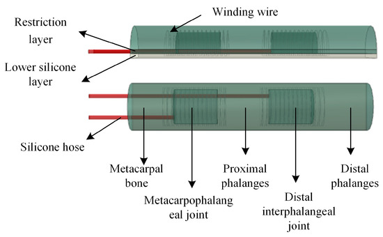 The soft actuator is based on the pneumatic fiber-reinforced drive principle, and the central part is made of silica gel material. The soft actuator (Figure 1) is mainly divided into a silicone gas pipe, an axial fiber restraint layer, an upper and lower silicone body, and a winding thread. The silicone body consists of two flexible joints, two finger bones, and the lower part of the metacarpal, which acts as the fixing end. In the actuator bending experiment, gas can be passed into the corresponding joint through two silicone gas tubes. Because the radial winding line of the joint restricts the expansion of the actuator joint, the limiting layer at the bottom restricts the axial stretch of the actuator, resulting in the bending deformation of the actuator in the joint part. At the same time, the two joints are entirely independent of each other, which can achieve the effect of different degrees of bending angles of the two joints. Because finger bones are made of solid silica gel, they do not bend. The overall bending angle of the actuator can be regarded as the superposition of the bending angles of two air cavities, which conforms to the structural characteristics of human fingers and can effectively fit the surface of the grasped object.