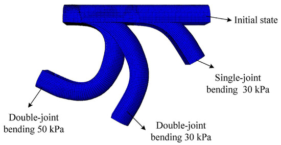 After determining the deformation mechanism and the actuator’s structure, finite element simulation software abacus was used to analyze the actuator to find the correct structural parameters of the soft actuator. The mesh property of the silica gel material was set to an eight-node linear hexahedron element, C3D8H; the axial fiber limiting layer was set to a four-node curved thin shell, S4R; the winding part was set to a secondary beam element, B32; and the interaction part was set to the built-in constraint modeling the actuator. Internal pressure perpendicular to the surface was applied to the inside of the actuator. The bending deformation effect of the actuator is shown in Figure 2, without considering the influence of gravity on the actuator.