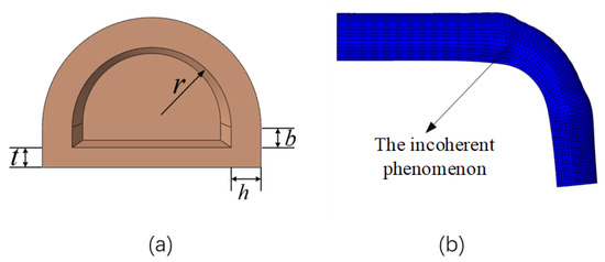 In an early experiment, the influences of structural parameters such as joint length, wall thickness, radius, coil number, and cavity section rectangle height on the bending performance of the actuator were studied to determine the optimal structural parameters of the actuator. Based on the semicircle section [27], the semicircle plus rectangle section shape was determined to be more conducive to the bending and deformation of the actuator. The section shape diagram and structural parameters of the actuator are shown in Figure 3a and Table 1. In the simulation experiment of the number of winding coils of the actuator, to better realize the bending effect of the actuator and to prevent the separation of the upper and lower layers of the actuator, the incoherent phenomenon occurred in the joint and finger bone when the actuator was bent, as shown in Figure 3b. At the same time, considering that the length of the air cavity of the actuator was finally determined to be 20 mm, the winding distance was expanded to 30 mm, the number of winding coils was set to 16 turns, and the corresponding helical pitch was set to 2 mm. The reasonable selection of the number of winding coils limits the circumferential expansion of the actuator, which is conducive to enhancing the bending effect of the actuator [28]. We selected a small segment of actuators as our study objects. The actuator segment length, u 0 , and width, v 0 , can be expressed as follows: