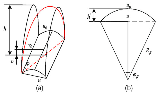 The angle of the segment, φ β , the radius of curvature, R β , the length, u, the fiber helix angle, φ , and the height of the arch, h , caused by the bottom bend can be derived from the geometric relationship shown in Figure 4: