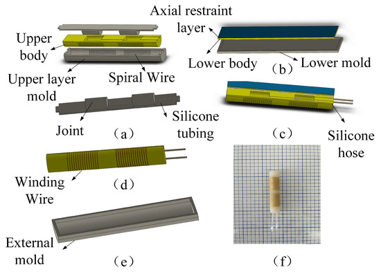Figure 5. (ae) Soft actuator production process. (f) Photograph of soft actuator.