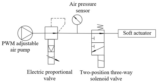 To achieve a bending effect at the joint of the soft actuator, the pneumatic execution system, as shown in Figure 6, can be used to control the gas generated by the air pump. In this paper, the Kamoer miniature vacuum air pump is selected. The maximum pressure of this air pump is 90 kPa. The size of the duty cycle of the gas pump input signal is adjusted to change the output gas flow rate, and the maximum flow rate is set to 1.1 L/min. The ITV1010-212L electrical proportional valve adjusts the gas produced by the air pump.