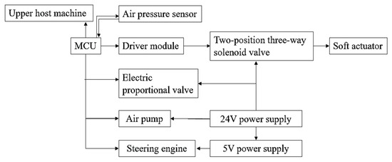 A connected air pressure sensor can monitor the size of the air pressure value of the whole system in real time and feed it back to the host computer. After stabilizing the air pressure, the gas flows into the flexible actuator or is discharged through a two-position three-way solenoid valve to achieve the effect of inflating, exhausting, and maintaining the actuator. The control system, as shown in Figure 7, can be used for the bending and grasping experiment on the whole palm. The signal generated by the upper computer controls the MCU to issue corresponding instructions, and to command and control the driver module, electrical proportional valve, air pump, and steering gear. The drive module composed of uln2003 can be directly connected to the two-position three-way solenoid valve to control the switch of the solenoid valve, the electric proportional valve is used to determine the setting of the system pressure value, and the air pump is used to generate the gas required by the bending of the driver. The steering gear installed on the thumb can increase the degree of freedom of the thumb and thus drive the thumb to rotate at the corresponding angle on the palmar surface.
