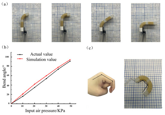 The gas produced by the air pump, through the input to the electrical proportional valve, can be output within the specified range of any pressure value. The gas output size was set as 0–50 kPa, and the gas pressure was gradually increased by 10 kPa to perform a bending experiment on the two joints of the actuator. Figure 8a shows the actuator’s bending effect. The bending angle of the actuator is recorded under different pressures. Figure 8b shows the linear relationship between the actuator input pressure value and the bending angle. When the input pressure value is 50 kPa, the bending angle of the actuator can reach 91°. When an equal amount of air pressure is applied simultaneously to both joints of the soft actuator, the actuator is bent to match the bending characteristics of the human finger. The bending effect is shown in Figure 8c. The results show that the actuator can achieve a bending effect under the pressure of both joints which is very similar to the bending effect of human fingers.