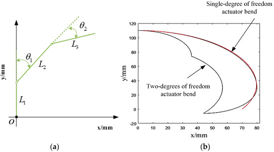 Figure 9. (a) Soft actuator structure simplification. (b) Comparison of single-degree-of-freedom and double-degree-of-freedom soft actuator end trajectory.