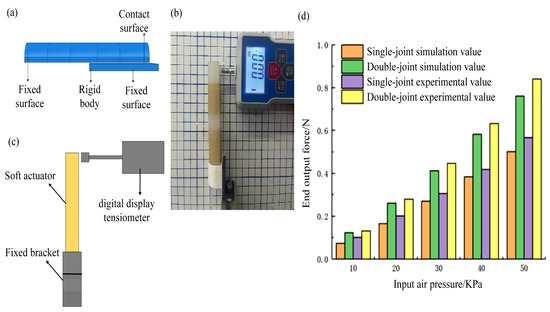Figure 10. (a) Soft actuator end force simulation model. (b,c) Actual measurement experiment platform. (d) Comparison of experimental and simulated values of end force.