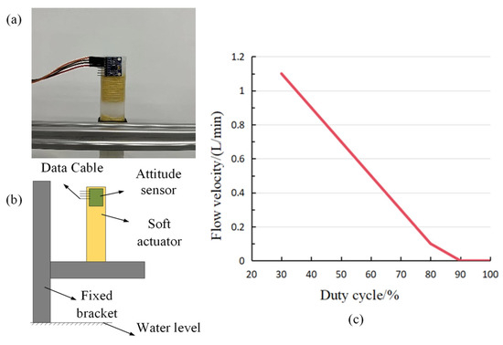 Figure 11. (a,b) Bending speed experimental measurement platform. (c) Air pump duty cycle and gas flow rate relationship.