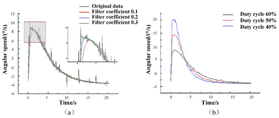 Figure 12. (a) The influence of the selection of raw data and different filtering coefficients on the results of experimental data. (b) The relationship between the magnitude of the duty cycle of the air pump input signal and the angular velocity.