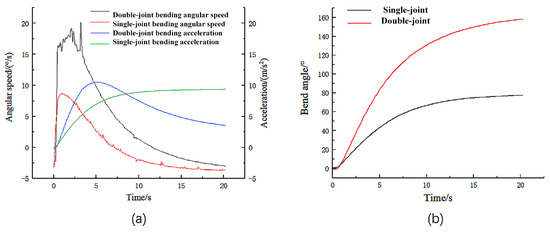 Figure 13. (a) Variation in angular velocity and acceleration with time when the duty cycle is 60%. (b) Relationship between angle and time.