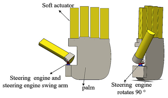 Scientists have been inspired by natural creatures such as octopus tentacles [4], plant twines [5], spiders [6], and fish [7] to create soft robots that mimic humans. In the rehabilitation training of people with hand injuries and the development of rehabilitative hands [8,9], surgical treatment [10], and diving operations [11,12], soft robots show higher safety and flexibility, and better human–machine interaction. Flexible manipulators composed of soft actuators have achieved remarkable results because of their soft contact material and simple structure, showing high safety and flexibility when grasping objects. Their design concept can be extended to flexible hands with strong grip, precision grip, and dexterous hand manipulation [13]. Some flexible manipulators can also be made via modular construction, so rapid prototyping is performed to achieve different functions [14]. From a three-finger soft grip to a five-finger soft grip, a dexterous hand offers an excellent gripping or grasping effect on objects [13,14,15,16]. Scientists have improved the gripping capability of actuators by combining multiple actuation methods [17,18,19], increasing the material filling, using fiber material composition [20,21], and adopting structural optimization methods to enhance the rigidity of actuators [22,23,24,25,26]. However, when limited by a single degree of freedom, actuators perform one-piece bending. They cannot effectively simulate human finger joint independent bending, which leads to a limited contact area with the object when grasping, and dexterous hands with relatively few degrees of freedom of control, hindering the reliability of grasping. It is difficult to achieve in-hand horizontal and vertical movements and the rotating of objects by dexterous hands, thus greatly limiting application and development.