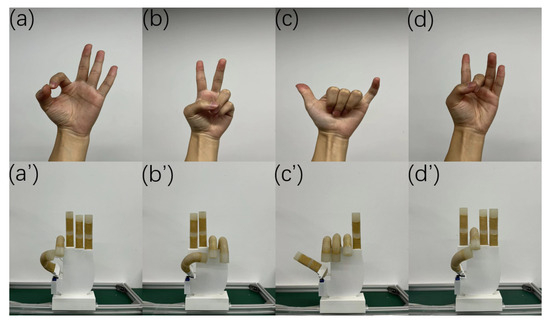Figure 15. Dexterous hand; four gestures. (ad,a′d′) show the “Ok” gesture, the victory gesture, the “six” gesture and the orchid hand gesture, respectively.