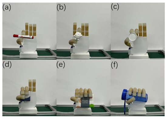 Figure 16. Dexterous hand grasping experiment. (a,b) Two-finger grasp. (c,d) Three-finger grasp. (df) Five-finger grasp.