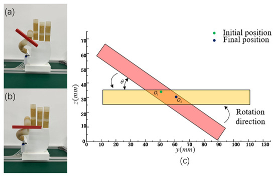 Figure 19. A rotation angle experiment. (a,b) Rotation angle change of rectangular objects. (c) Rotating experimental model.