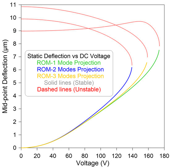 Figure 2 shows the variation in the midpoint deflection as a function of the static voltage DC for three developed ROMs. In all cases, only one branch of stable equilibria, marked as solid lines, and one branch of unstable equilibria, marked as dashed lines, were observed. The static results show that at least three symmetric modes, marked as yellow line (—), are required for satisfactory model convergence compared to lower-mode approximation, which results in quantitative error. This error is clearly visible along the unstable branch of equilibria.