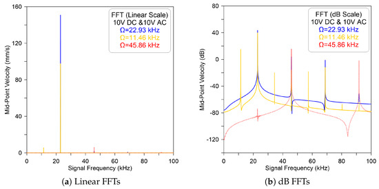 Figure 3a,b show the FFT signals in linear and dB scales, respectively, for the sensor’s velocity when the excitation frequency is set to kHz. It demonstrates evidence of the primary resonance with a large peak that appears at for the first case, marked as blue line (—), and smaller peaks appearing at , where . On the other hand, observing superharmonic resonance involves exciting the system with a signal frequency that is half of the fundamental frequency. In this case, we kept the voltage similar to the previous case and set the excitation frequency to kHz.