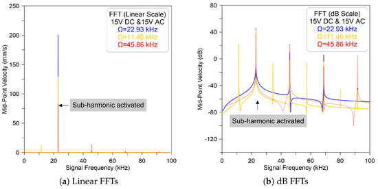 In addition, increasing the signal frequency to kHz leads to a similar behavior with a large peak appearing at , denoted by a dashed red line (- - -). This is an indicator that subharmonic resonance is not activated. It can be confirmed from the FFT signals, as shown in Figure 3a, for the linear scale and (b) for the dB scale, where only peaks appear at , where , , and small peaks at half . We note that the large harmonic peaks are clearly visible on the dB scale. Indeed, to activate subharmonic resonance, a higher forcing level is required.