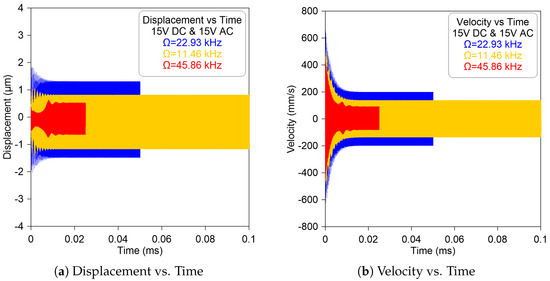 In addition, the time histories at DC = AC = 15 V of the sensor’s midpoint displacement and velocity are shown in Figure 7a,b, respectively. The appearance of a sudden expansion in the displacement envelope is evidence that the lower harmonic component with a single period has activated the subharmonic resonance of order one-half, resulting in a resonant response with a period equal to twice the excitation frequency. The figure shows that the displacement and velocity are perfectly proportional to each other at any giving excitation frequency.