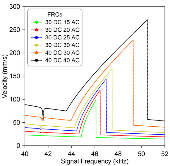 The dynamic response of the sensor was investigated by subjecting it to a frequency-sweep test in the vicinity of the subharmonic resonance of the first in-plane bending mode. Then, the variations in the amplitude of the sensor midpoint velocity under different excitation waveforms and a signal frequency in a range of 40–54 kHz were evaluated using the shooting method to generate periodic orbits and to determine their stability by evaluating their Floquet multipliers.