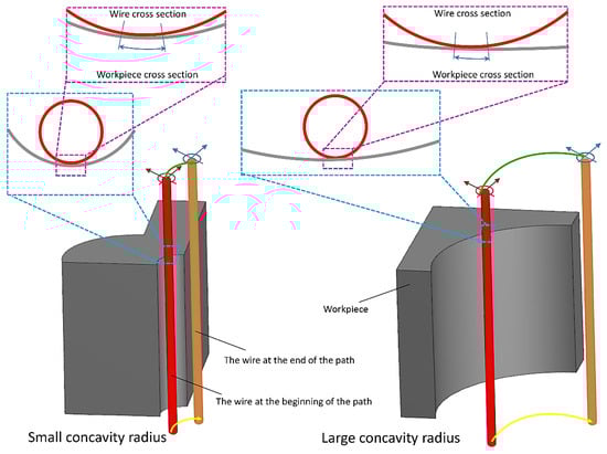 The length of the wire engagement (contact) segment with convex, flat, and concave surfaces increases from low to high. This case is shown in Figure 11 and Figure 12 for convex and concave samples with different radii of curvature. For a more extended engagement (contact) sector, each point on the surface is subjected (exposed) to an electrical discharge for a longer (more extended) time, and its temperature increases more. Therefore, it is more susceptible to thermal damage when cooled by the dielectric fluid. In addition, prolonged exposure to heat leads to spheroidization of the molten material at the cutting region (zone), spreading frozen particles and deposits on the surface. From this point of view, there is a significant difference between the SEM images of the samples.