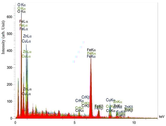 Therefore, three graphs obtained from the EDS spectroscopy method were matched, and it was observed that there are differences in the percentage of selected elements on the recast layer surface. As seen in Figure 18, three different colors are used to display EDS charts. The red, green, and blue colors represent the EDS diagrams of recast layers with three, two, and one passes in the wire discharge process. Two elements, copper (Cu) and zinc (Zn), were used to investigate the effects of the cutting wire on the recast layer. The intensity of the presence of these two elements on the recast layer is observed from high to low for one, two, and three cutting passes. This means that when the electric discharge energy is lower in the second and third passes, the amount of wire erosion was such that its effects on the recast layer surface were smaller.