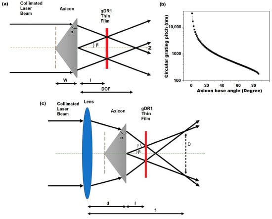 Equations (1) and (2) are plotted in Figure 1b to illustrate how the pitch of the circular interference pattern varies with the base angle of the axicon (α). For α = 1, the circular pattern pitch value is approximately 30 μm, while for α > 30°, the pitch value of the concentric circular gratings falls below 1 μm, which is comparable to subwavelength nanostructures. The interference patterns of Bessel beams caused by an axicon can be inscribed on thin films of azobenzene molecular glass, as shown in our previous work []. However, the main drawback of this axicon interference lithography method is that each base angle (α) corresponds to only one pitch value. Therefore, to make concentric circular gratings with different pitch values, different axicons with specified base angles are required. To overcome this problem, a new approach is presented here.