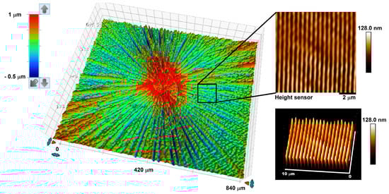 Using this technique, five different concentric circular gratings were fabricated using the same axicon, which had a base angle of α = 45.0 ± 0.5°, on azobenzene molecular glass thin films with pitch values of 660 nm (C1), 584 nm (C2), 574 nm (C3), 553 nm (C4) and 469 nm (C5). Figure 2 shows the 3D optical profilometry image from the surface of a typical concentric circular grating thin film (sample C4). The optical profile shows a texture attributed to an area of 800 × 800 μm around the center of the circular grating. The topography of the film containing the radial grooves and central distortions on the surface of the gDR1 thin film can be clearly seen in this image. This is caused by the optical aberrations of the axicon and the high intensity of the Bessel beam around its center, which damaged the film []. However, when one focuses on areas beyond the central region, clear nanostructures, corresponding to constant-pitch circular gratings, are distinguished in radial positions. A zoomed-in 2D and 3D atomic force microscopy (AFM) imaging of a smaller area (10 × 10 μm) approximately 200 μm away from the center revealed the surface relief nanostructures as a portion of a concentric circular pattern (Figure 2).