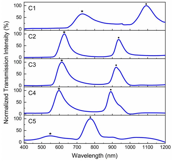The plots in Figure 3 are the normalized transmission through the concentric circular gratings. Generally, surface plasmon resonance is observed as positive peaks in transmission and negative dips in reflection at the wavelength calculated according to Equation (6). However, once a plasmonic device is placed in between crossed polarizers, one should always detect a positive peak in both transmission and reflection. Here, the SPR plots of each concentric circular grating in Figure 3 are composed of double positive peaks marked by a star and a dot, as summarized in Table 1.