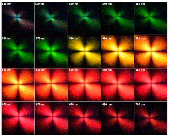 Another feature in Figure 4 is that the images show the SPR visual wavelength band responses generated when polychromatic light is being shone on the entire crossed polarized setup. Therefore, the SPR photographs in Figure 4b–d are a mixture of different wavelengths of excited SPR light, from the wavelength at which a peak starts to the point at which it ends, as presented in Figure 3 in the form of plots. To improve this photographic method and the visual recognition of the excited SPR from the concentric circular gratings, a Kurios® (Thorlabs, Newton, MA, USA) programmable liquid crystal tunable filter with narrow 10 nm bandpass filter was used in conjunction with the Halogen lamp to take real-time images between wavelengths of 510 nm and 700 nm at 10 nm intervals. The narrow output bandwidth light from the tunable filter was horizontally polarized and, as it was transmitted through the circular grating, it went through a secondary vertical polarizer before reaching the camera. In Figure 5, it can be seen that the intensity and color of the surface plasmon resonance signals from sample C2 change as the wavelength of the incident light is varied between 510 nm and 700 nm. It is visually clear that the maximum intensity falls between 580 nm and 630 nm, which corresponds to the C2 plot in Figure 3. A real-time video was recorded by the camera from the plasmonic response of C2 as the wavelength of incident light varied repeatedly from 510 nm to 700 nm with 10 nm bandwidth steps. The video showed a shimmering effect according to the intensity changes of the excited SPR within the adjusted range of wavelengths of the filter (See Supporting Information Video S1).