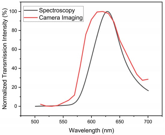 The intensity of each image in Figure 5 was measured using ImageJ v1.53k software and plotted against the wavelength of incident light. Figure 6 compares the normalized intensity of the transmitted SPR light from sample C2 when it was placed in between crossed polarizers measured by the spectrometer versus the real-time camera imaging technique. An obvious SPR peak can be seen in Figure 6, which is generated by the intensities of the camera images, and the peak is very similar to data collected by the spectrometer. To calibrate the camera, images of different wavelengths of light, obtained through the liquid crystal filter, which were tuned between 500 nm and 700 nm were taken, and their intensities were used as a reference to normalize the intensities extracted from the SPR images. In Figure 6, there is a slight shift in the position of the peak obtained by the camera (λmax = 620 nm) compared to the spectrometric spectrum, which is due to the 10 nm bandwidth of the liquid crystal filter used in this study, which, as a result the intensities, were averaged within the 10 nm region. This study proves that the real-time imaging of SPR signals can be utilized as a high-accuracy colorimetric imaging technique instead of spectroscopic ones as a tool in various applications such as sensors or visual detections.