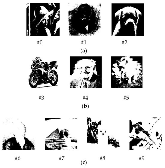 The original images are grayscale images with the size of 32 × 32. Binary images are produced by thresholding grayscale images. By varying the threshold, we obtain images with different data densities. The first three images (#0, #1, and #2) have a low data density of 0.25, the next three images (#3, #4, #5) have a moderate data density of 0.5, and the last four images (#6, #7, #8, and #9) have a high density of 0.75. These different data density images are then vectorized to the size of 1024 × 1 and stored in the memristor arrays of the complementary crossbar architecture and the single crossbar architecture. Each image is stored in a column of the array. Binary images with different data density produced by thresholding grayscale images are shown in