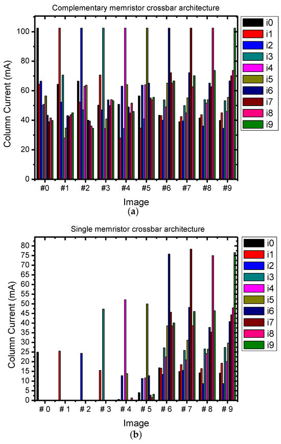 at every output column current. In addition, the subtraction in Equation (5) can yield negative values when the input image has few white pixels or low data density, and these negative values do not generate any current to output column currents. Therefore, when recognizing input images with a low data density of 0.25 by the single crossbar architecture, the maximum column current reduces about 4 times in comparison with by the complementary crossbar architecture, and the rest column currents are 0. When the data density is 0.5 (images #3, #4, #5) and 0.75 (images #6, #7, #8, #9), the maximum output column currents produced by the single crossbar architecture are also decreased, equal to around 0.5 and 0.75; the largest one is generated by the complementary crossbar architecture.