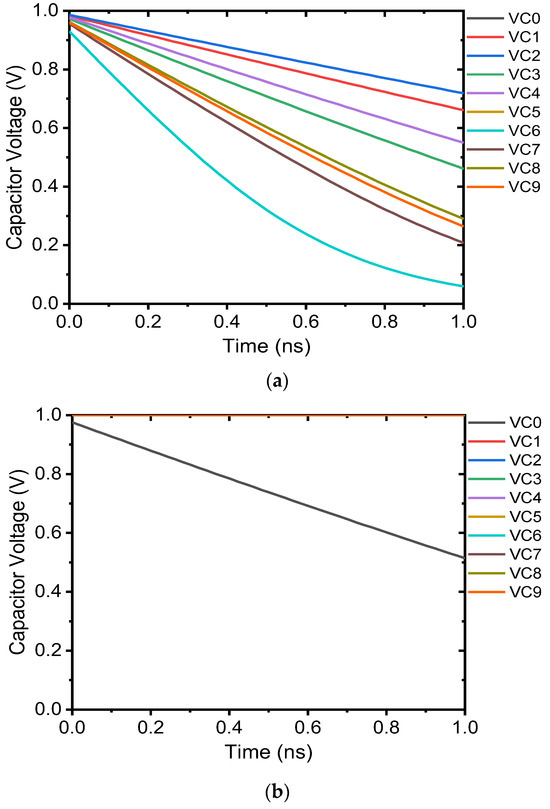 Because the Winner-take-all circuit is based on the output column currents, this reduction in the maximum output column current of the single memristor crossbar architecture should be considered. As represented in previous section, the output column currents from memristor crossbars cause the pre-charged capacitors, the to , to discharge at different speeds. When an output column current is high, it makes the corresponding capacitor discharge fast, and a capacitor will discharge slowly when the corresponding column current is low. The discharging voltages, the to , from the pre-charged capacitors is fed into the winner-take-all circuit to determine the maximum output current, corresponding to fastest discharging voltage. When the fastest discharging voltage degrades to below the reference voltage of 0.5 V, it makes the Pulse Generator create a pulse to lock the wining output among all outputs, from to . If the becomes 1 while the others are 0, it indicates that is the fastest discharging voltage or the input image best matches the pattern pre-stored in the column.