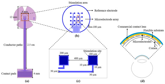 The shape of the device and contact vias are defined by the second level of the mask; see Figure 1a (pink pattern). As it is shown, the design comprises all of the metallic structures, with the surface of the contact pads and that of the microelectrodes exposed for electrical connections to the external equipment and cornea, respectively. In addition, the shape of the device includes three petals for the stimulation area to facilitate its attachment to a contact lens. It is important to mention that the microelectrode array was designed to cover the central area of the cornea, but it can be easily adapted to cover either the peripheral or the total area.