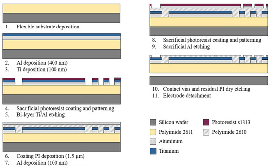 After photoresist removal, a passivation layer of Polyimide 2610 (PI-2610, HD MicroSystems™, Parlin, NJ, USA) of 1.5 µm of thickness was spin-coated and cured. Then the PI-2610 surface was treated by oxygen plasma for 30 s, and a 100 nm-thick Al layer was deposited by cathodic sputtering. A standard photolithography process was carried out on the resulting aluminum layer, and this layer was selectively etched using a solution of phosphoric acid (H3PO4), glacial acetic acid (water-free CH3OOH), and nitric acid (HNO3) in a volume ratio of 25:7:1 (Al-etch). Then, to define the final shape of the device and contact vias, the polyimide was selectively etched using oxygen plasma for 6 h. Finally, the electrode was carefully detached from the silicon wafer in DI water.