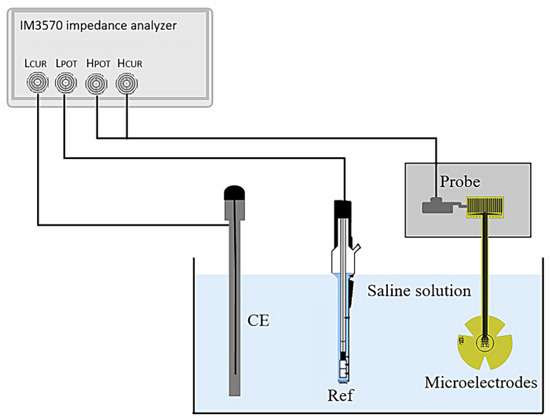 The electrical impedance of the fabricated microelectrodes was measured using a three-electrode system, as shown in Figure 3. The microelectrodes under test were connected via probes and immersed in physiological saline solution (0.9% NaCl) at room temperature. A platinum (Pt) wire was used as the counter electrode (CE), and a silver/silver chloride (Ag/AgCl) electrode (Ref) served as the external reference.
