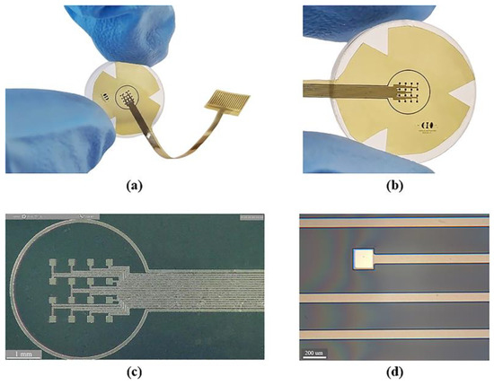 Figure 4 shows the sectioned surface electrode fabricated. Figure 4a illustrates the flexible electrode placed on a glass concave surface to simulate its placement along the curvature of the cornea; a magnified image of the microelectrode array is shown in Figure 4b. The metal patterns of the microelectrodes and conductor paths before and after their removal from the silicon wafer are shown in Figure 4c,d.