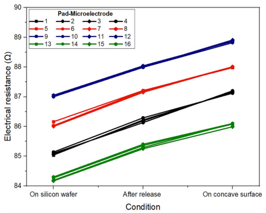 In the proposed design, the conductor paths have four different lengths: 3.60 cm, 3.62 cm, 3.64 cm, and 3.66 cm, while the electrode pads (3.5 mm × 0.28 mm) and microelectrodes (200 µm × 200 µm) maintain the same size. Considering these dimensions, the electrical resistance for each pad-microelectrode was analytically calculated as: 84.15 Ω, 84.61 Ω, 85.17 Ω, and 85.72 Ω, respectively. The experimental electrical resistance of each pad-microelectrode was measured for the three types of proposed conditions: at wafer level, after being released from the wafer, and when placed at the concave surface. The results obtained can be seen in Figure 5.