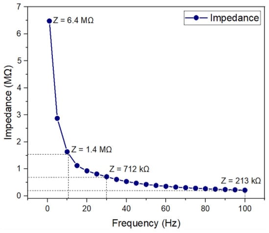 For the clinically relevant frequency range (from 11 Hz to 30 Hz), impedance values are 1.4 MΩ to 712 kΩ. These results are comparable to those of other microelectrodes, which reported impedance values on the order of several hundreds of kΩ [22,23,24,25,26]. This indicates that the fabricated microelectrode array might be appropriate for ES.