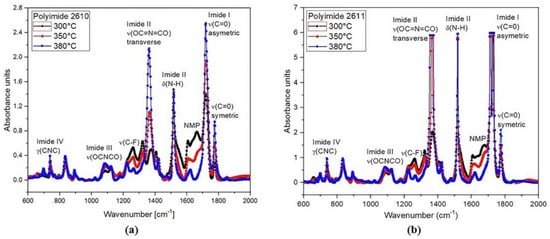 FTIR spectral absorbance in the region of 600 cm−1 to 2000 cm−1, at 300 °C, 350 °C, and 380 °C for (a) PI-2610 and (b) PI-2611.