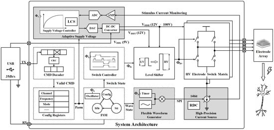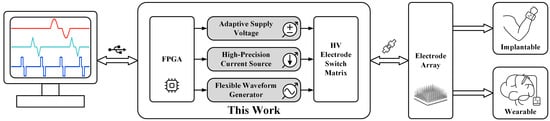 To overcome the aforementioned issues, a competitive CCS prototype based on commercial discrete components and a field programmable gate array (FPGA) is presented in this paper, and three key techniques are developed to optimize the system’s performance. (1) Adaptive supply voltage. An over-voltage detection algorithm for adaptive voltage regulation is proposed, where the designed prototype can automatically adjust the output voltage from 12 V to 100 V in different scenarios through a feedback loop consisting of a digital-to-analog converter (DAC) and an analog-to-digital converter (ADC). (2) High-precision current source. Two 12-bit DACs with RDC are used to achieve a 14-bit output current of up to 6.5 mA. By combining this technique with an H-bridge stimulator structure, superior charge balancing performance can be achieved. (3) Flexible waveform generator. A finite state machine (FSM) is developed to control the two 12-bit DACs in real time when stimulation begins, thus producing arbitrary waveforms with a temporal accuracy of 1.6 μS. Figure 1 shows the conceptual structures of the proposed prototype based on these three techniques, which is controlled by a computer via a universal serial bus (USB) and connected to an electrode array for implantable and wearable applications.
