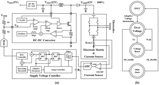 (a) Circuit implementation of the designed adaptive supply voltage block based on the proposed over-voltage detection algorithm. is the input voltage from USB, is the supply voltage for driver, and is the adaptive supply voltage for HV electrode matrix. is linearly related to the stimulation current. Supply voltage controller processes filtered and modulates DAC to control . (b) State transition diagram of the over-voltage detection algorithm.