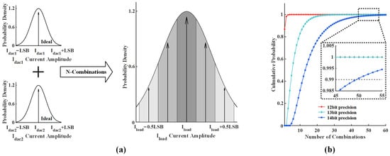To achieve a 14-bit current precision, a set of combinations whose absolute error is less than 0.125 LSB must be found for each . The gray regions in Figure 5a show five output currents with different values, LSB, LSB, , LSB, and LSB. All of the five output currents with an absolute error less than 0.125 LSB can be obtained by increasing the combination numbers n of and , while the can be any integer code of [0, 1, …, 4094, 4095]. Thus, the cumulative distribution function of obtaining the five desired output currents is